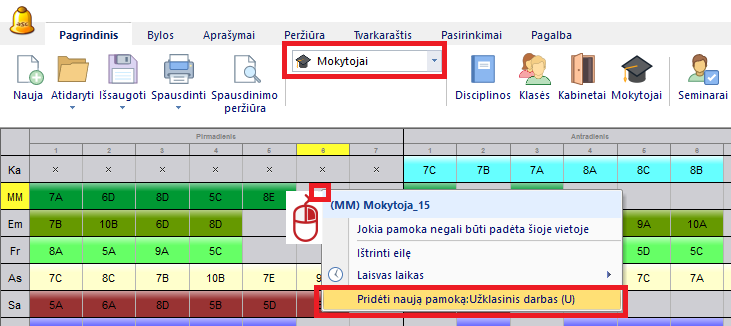 Tada pereikite į "Mokytojų" tvarkaraščio peržiūrą ir dešiniuoju pelės mygtuku spustelėkite reikiamą pamokos poziciją, norėdami greitai pridėti šią pamoką į mokytojo tvarkaraštį.