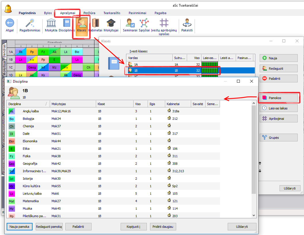 Kadangi pamokų klasėms įvedimo procedūra yra lygiai tokia pati kaip ir mokytojų pamokų įvedimo (tai yra, pamokas galim įvesti klasėms, pasirinkus reikiamą klasę klasių lange, arba mokytojams, pasirinkus reikiamą mokytojų lange - rezultatas bus tas pats), mes apie tai paaiškinsime plačiau aprašant mokytojų darbo laiko bei jų vedamų pamokų įrašymą į programą: Mokytojų darbo krūvio įvedimas