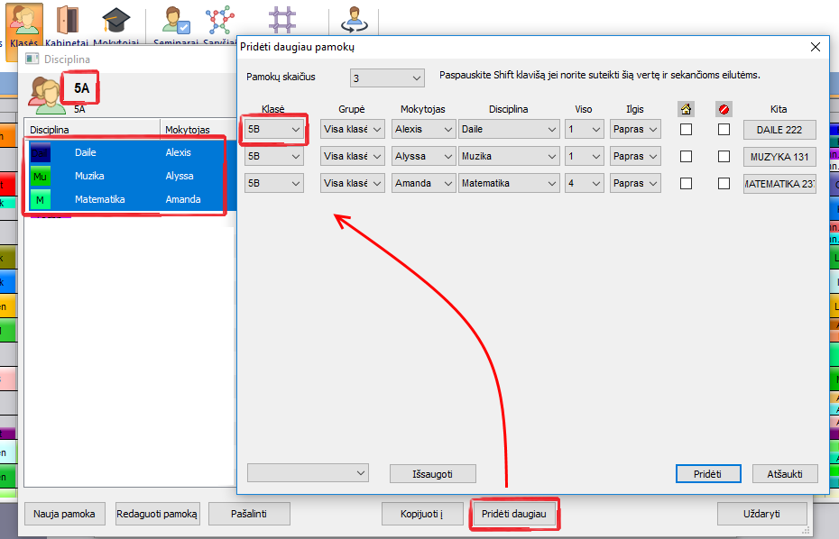 Jeigu daug klasių arba mokytojų turi panašias pamokas, jas klasei/mokytojui galima pridėti vienu kartu. Paspauskite mygtuką „Pridėti daugiau“ ir laukelyje lango dešinėje (viršuje, vadinasi „Pamokų skaičius“) nurodykite, kiek pamokų norite pridėti.