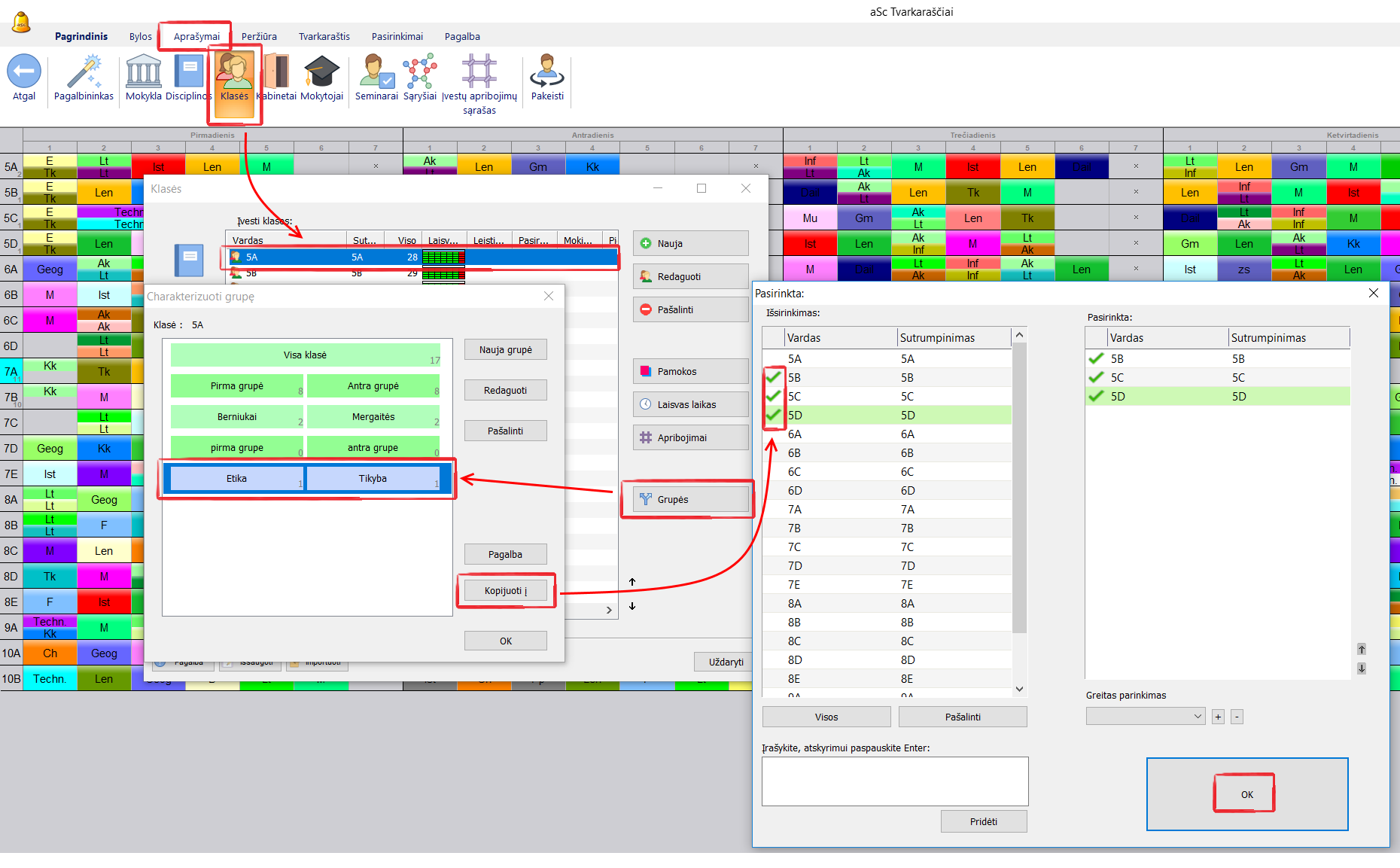 Kaip nukopijuoti padalijimus / grupes kitoms klasėms
