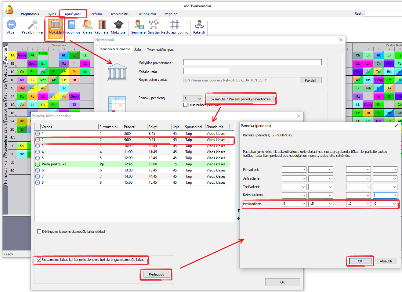 Jei kurią nors dieną skambučio laikas skiriasi, reikia pasirinkti tą periodą, pažymėti langelį "Šis pamokos laikas kai kuriomis dienomis turi skirtingus skambučių laikus" ir paspausti mygtuką "Redaguoti".