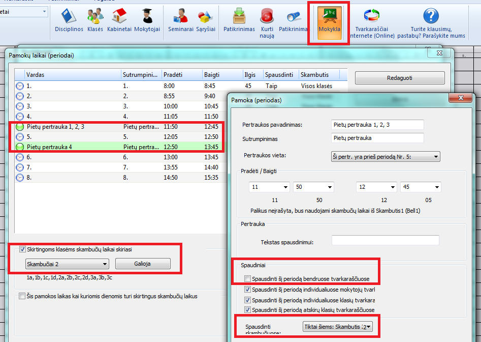 1.Įdėti dvi pietų pertraukas. Tada pirmajai nurodyti, kad ji turi būti spausdinama tik 1, 2, 3 klasėms (Skambutis 2):