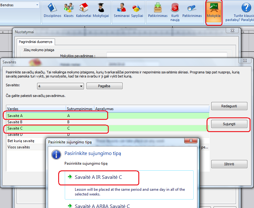 Tuomet kiekvienai pamokai bus galima nurodyti, kad ji, pavyzdžiui, gali vykti Savaitę A arba Lyginę savaitę (tuomet ji bus įdedama Savaitę A ir Savaitę C tuo pačiu laiku).