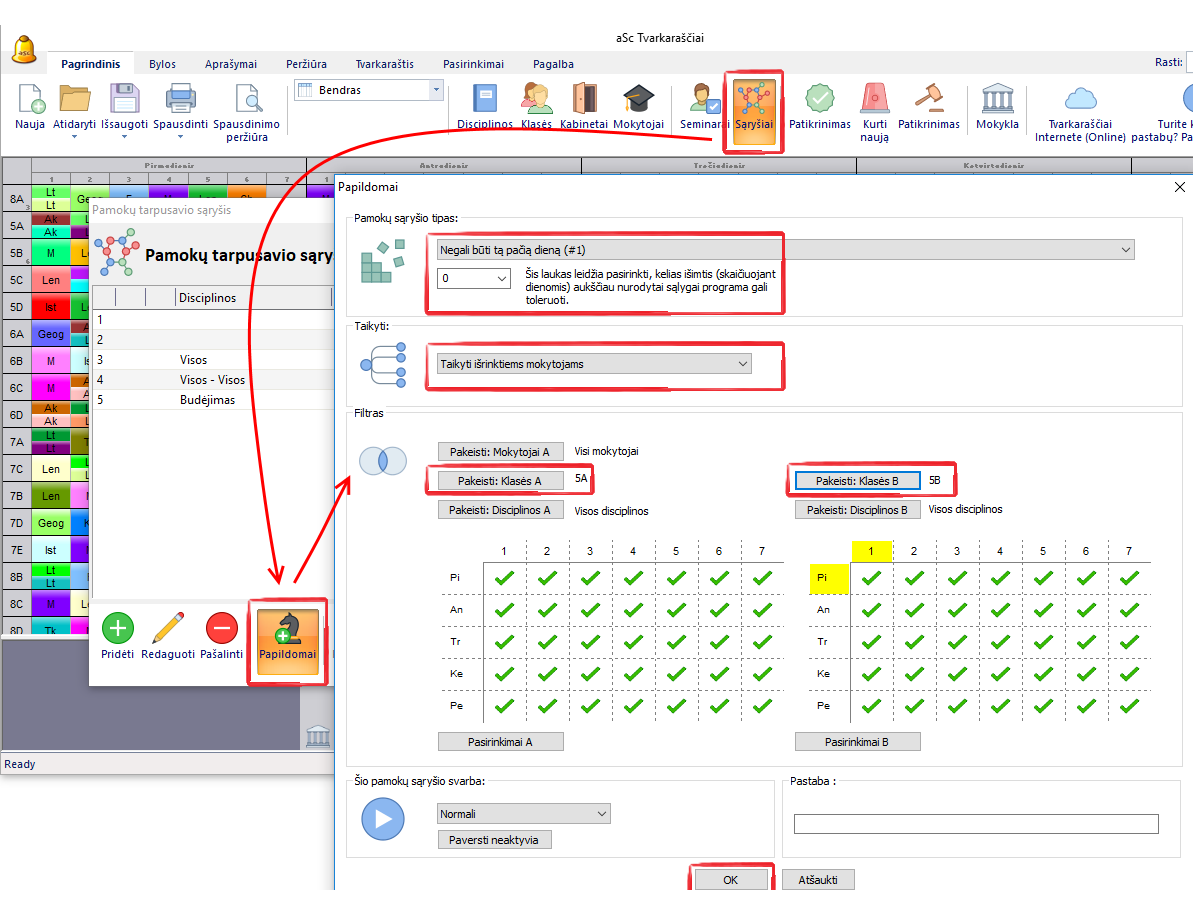 Galite pridėti sąryšį - jis reiškia, kad mokytojas negali turėti pamokų 5A ir 5B tą pačiią dieną (t.y. turi pamoką 5A klasei - tą dieną negalii turėti pamokų 5B klasei, ir atvirkščiai):