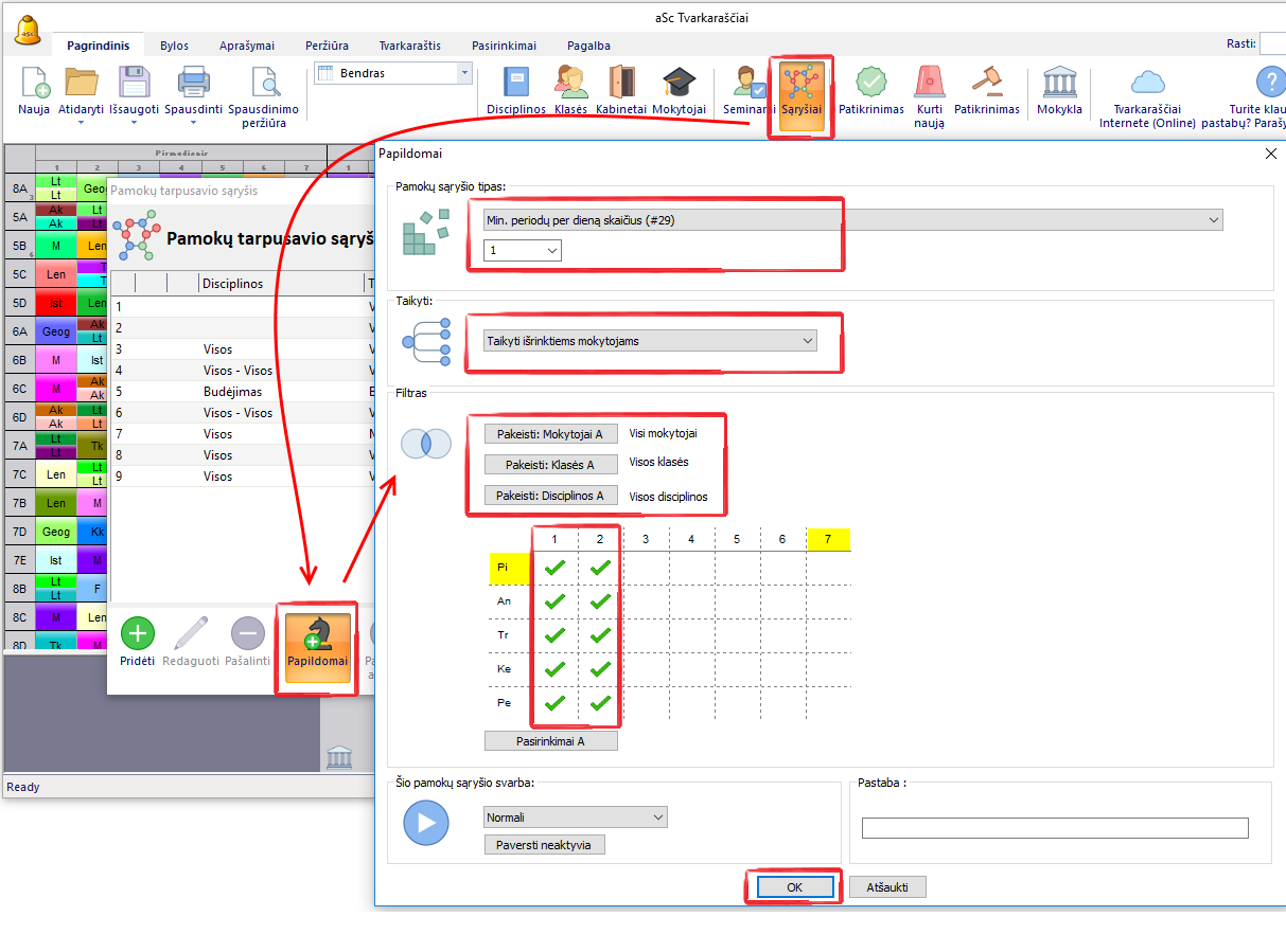 - Kaip ir kitų papildomų apribojimų atveju, pridėti šią sąlygą reiktų tik tada, kai jau turite daugmaž priimtiną tvarkaraščio variantą