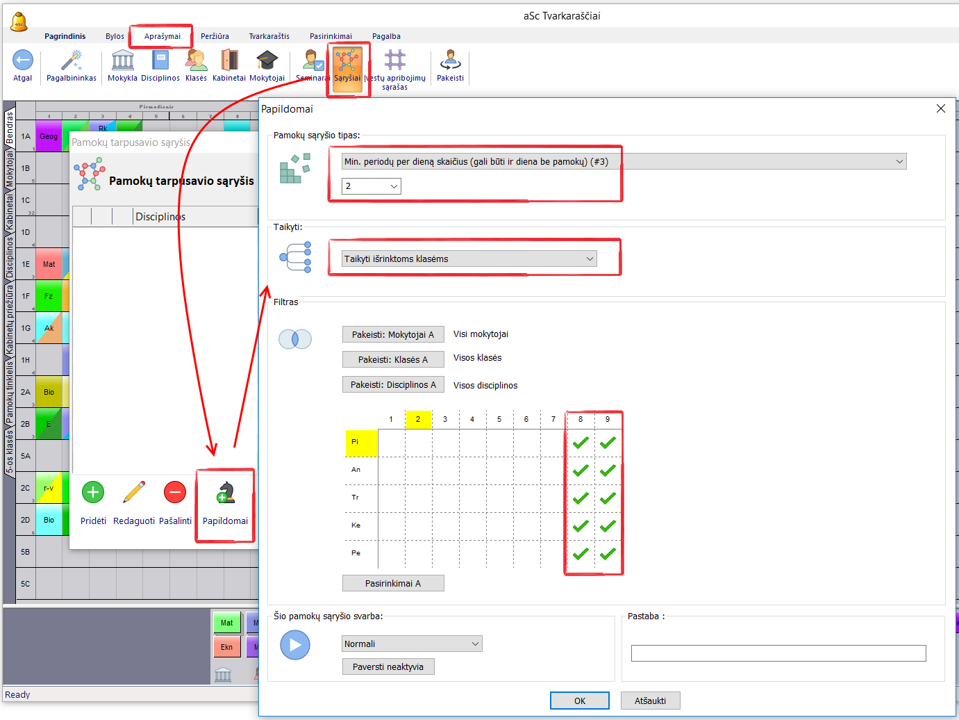 Pasirinkite meniu punktą "Aprašymai, Sąryšiai, Papildomai" ir nustatykite tokį sąryšį: