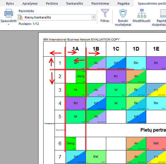Spausdinimo peržiūros lange linijas tarp stulpelių ir eilučių pavadinimų galima patempti su pele, ir tvarkaraštis išsiskleis į kelis lapus: