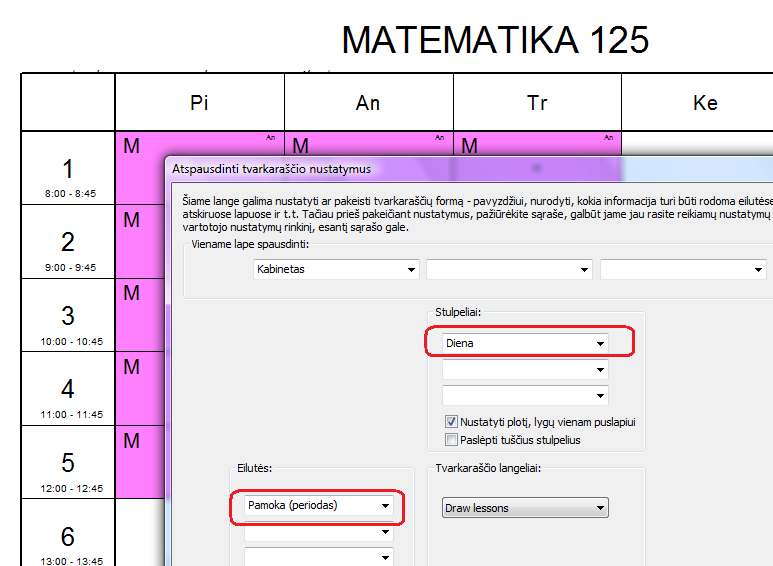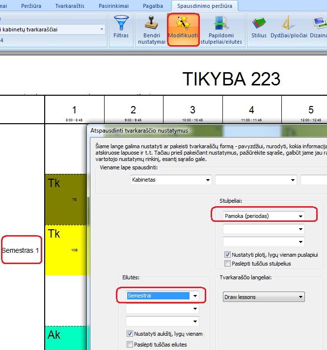 Jei reikia, galite atspausdinti ir tvarkaraštį kiekvienam mokiniui, nurodydami spausdinti ir semestro numerį: