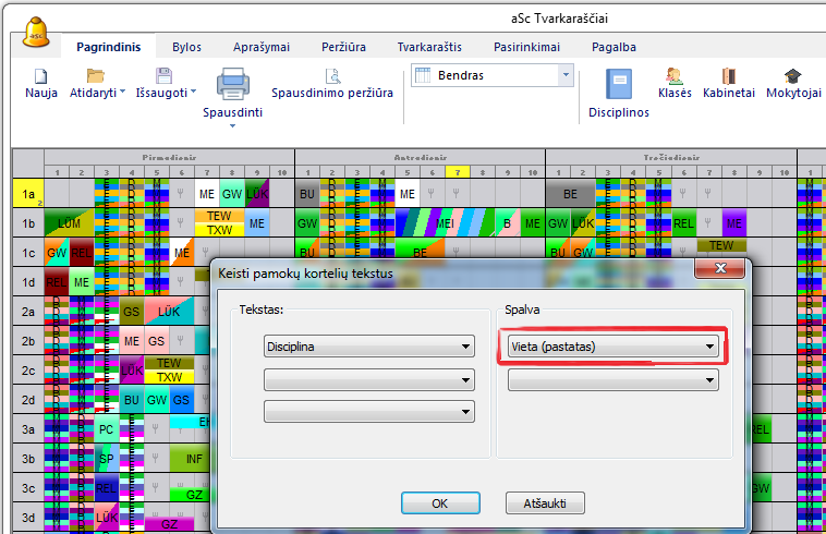 Čia galite, pavyzdžiui, pasirinkti, kad kabinetai būtų nuspalvinti disciplinos spalva, arba skirtingų mokyklos pastatų kabinetai būtų nuspalvinti skirtingomis spalvomis - tuomet galėsite lengvai atskirti, kuriame iš pastatų vyksta pamokos: