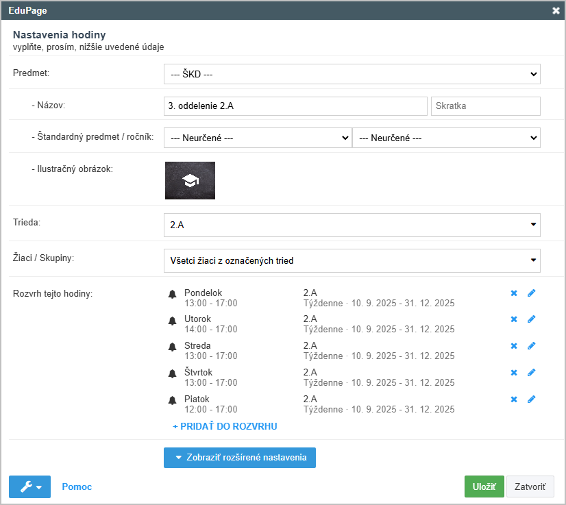 Pridať termín ŠKD do osobného rozvrhu môžete hneď pri vytváraní hodiny, alebo aj neskôr takto: