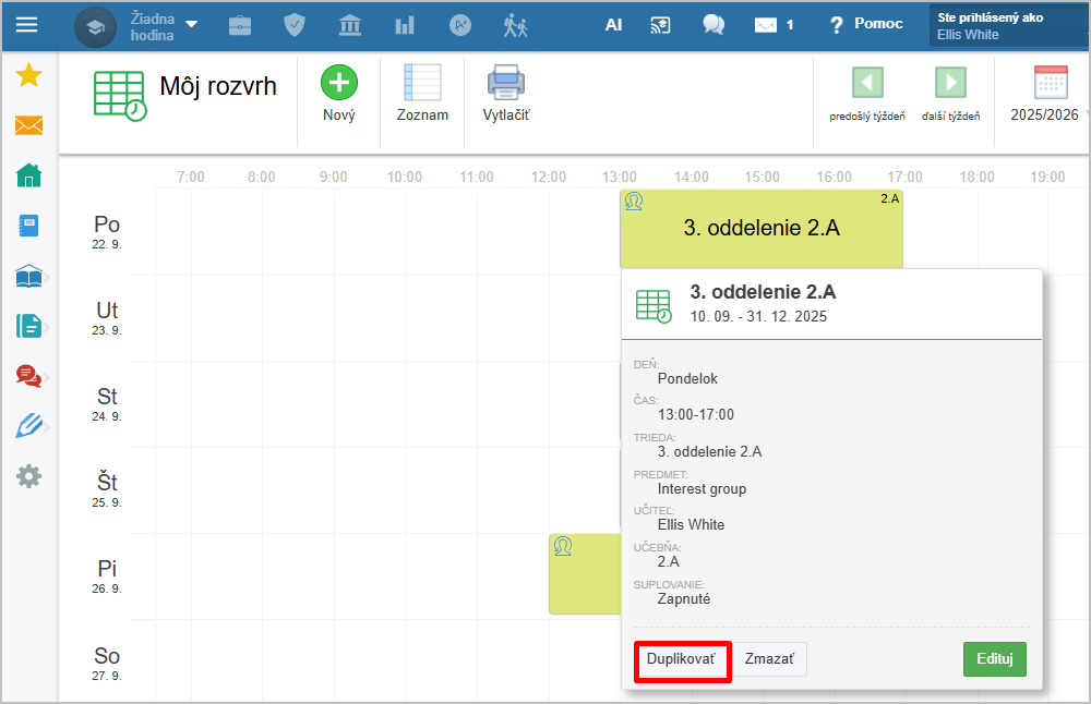 Môžete si pomôcť s funkciou Duplikovať, pomocou ktorej urobíte kópiu rozvrhu a zmeníte údaje, ktoré je treba zmeniť, napr. deň alebo čas.