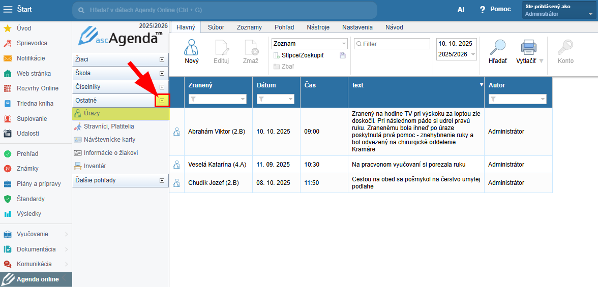 V EduPage sa evidencia úrazov vedie v  online agende v module Úrazy. Tu môžete pridať nový záznam o úraze, doplniť popis a okolnosti udalosti.