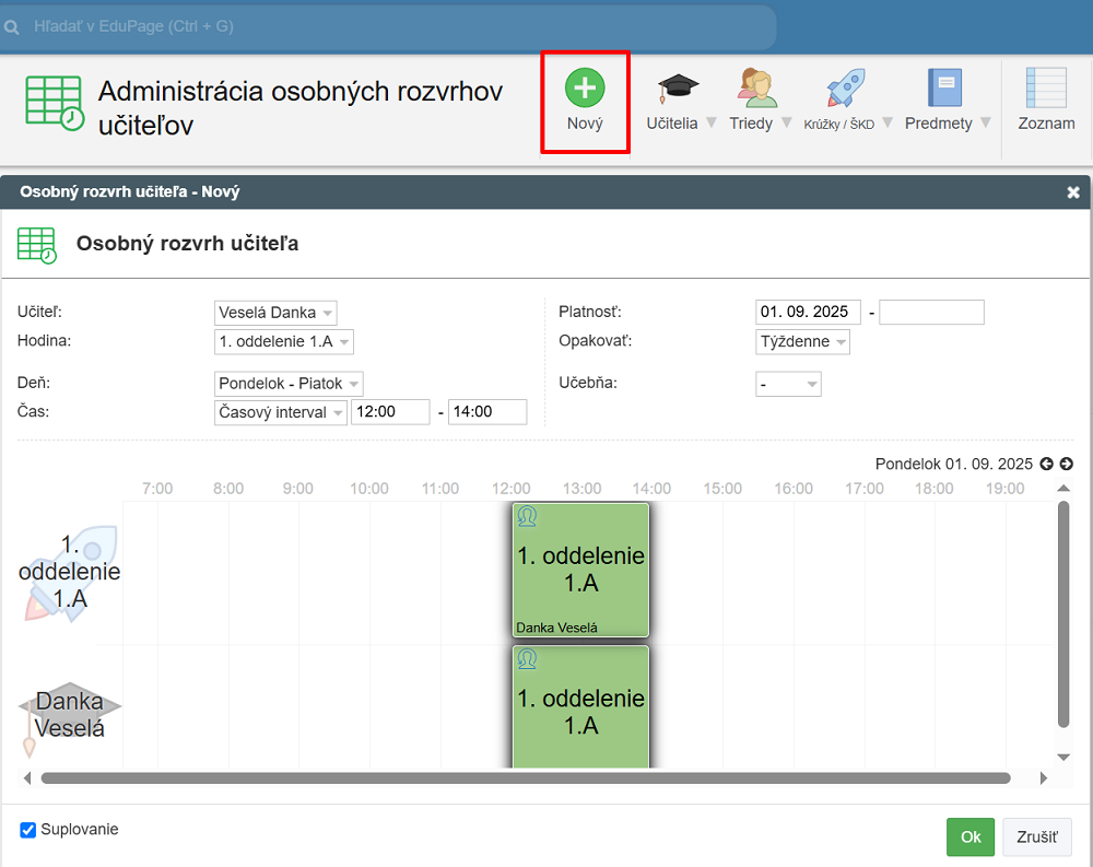 Cez tlačidlo Nový vytvoríme rozvrh pani učiteľke z 1.oddelenia s triedou 1.A. Hodina s touto triedou bude od 12.00 do 14.00 hod. Takto vytvoríme hodiny aj pre 2. a 3. oddelenie.