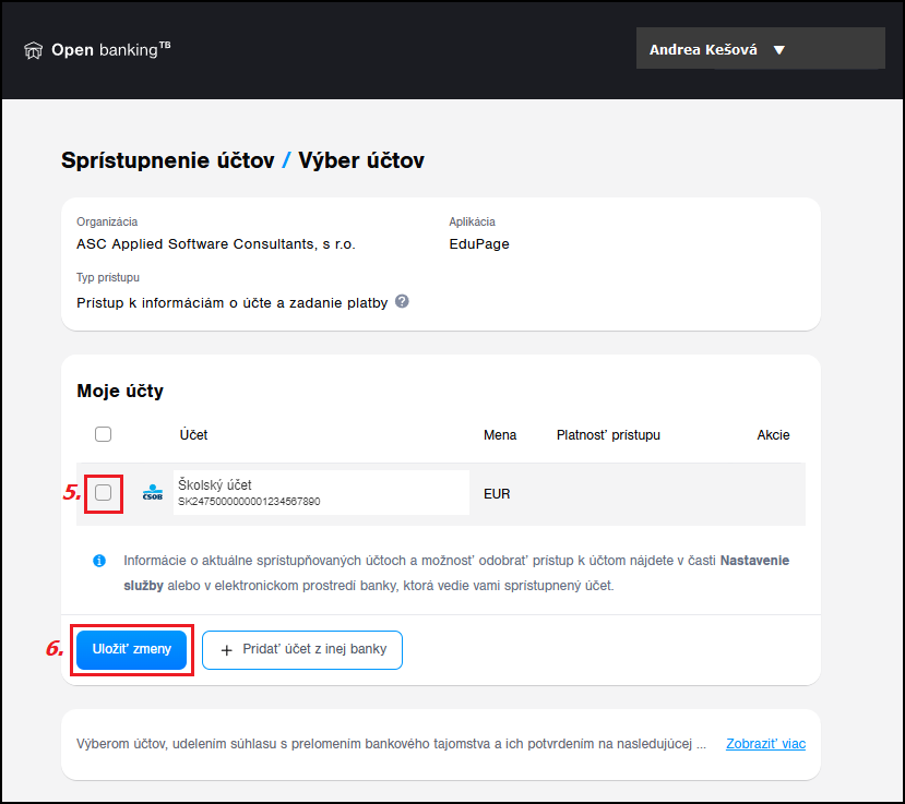 --> Teraz je ešte potrebné zakliknúť potrebné účty (5.) a Uložiť zmeny (6.) a Potvrdiť sprístupnenie účtov.(7.) (8.)