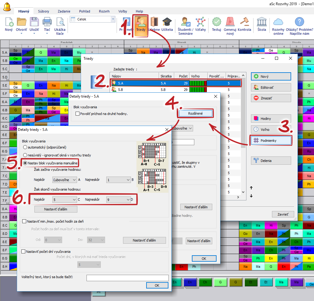 Tento automatický výpočet bloku vyučovania je vhodný pre väčšinu škôl. Avšak, ak trieda má 32 hodín a dovolíte 5-9 hodín denne, ptom musíte nastaviť blok vyučovania manuálne.