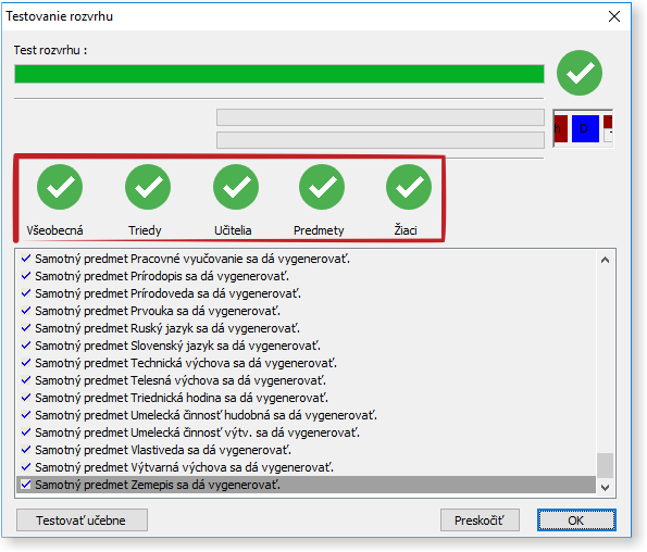 Predtým, než začnete generovať, je potrebné, aby váš rozvrh prešiel základným testom. Túto funkciu nájdete v hlavnej ponuke ako "Testuj" alebo v ponuke "Rozvrh - Testuj".