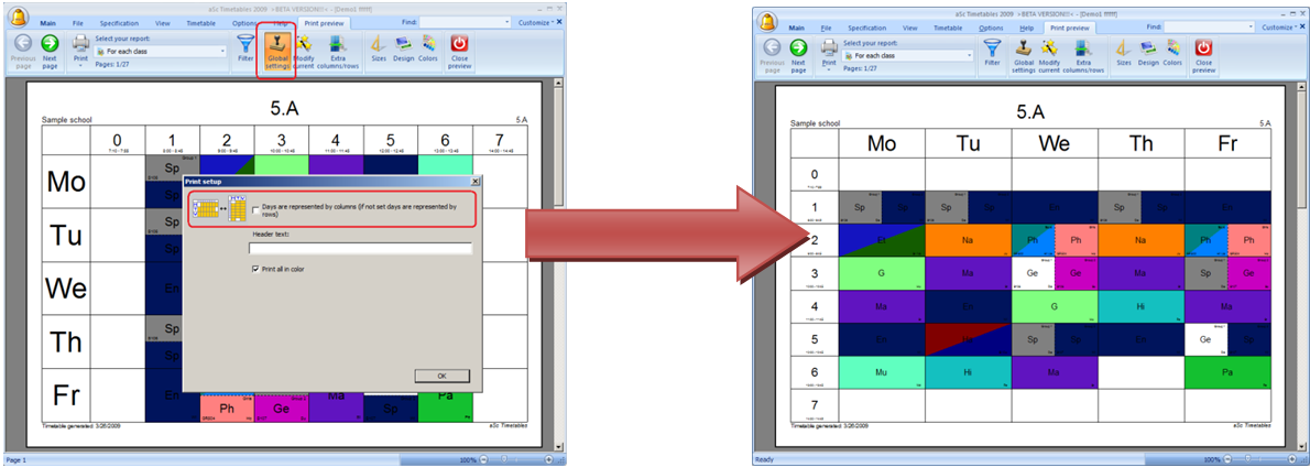 There is one central setting that can swap the layout of timetables for ALL printouts. Go to global settings and choose that lessons shall go to top from bottom: