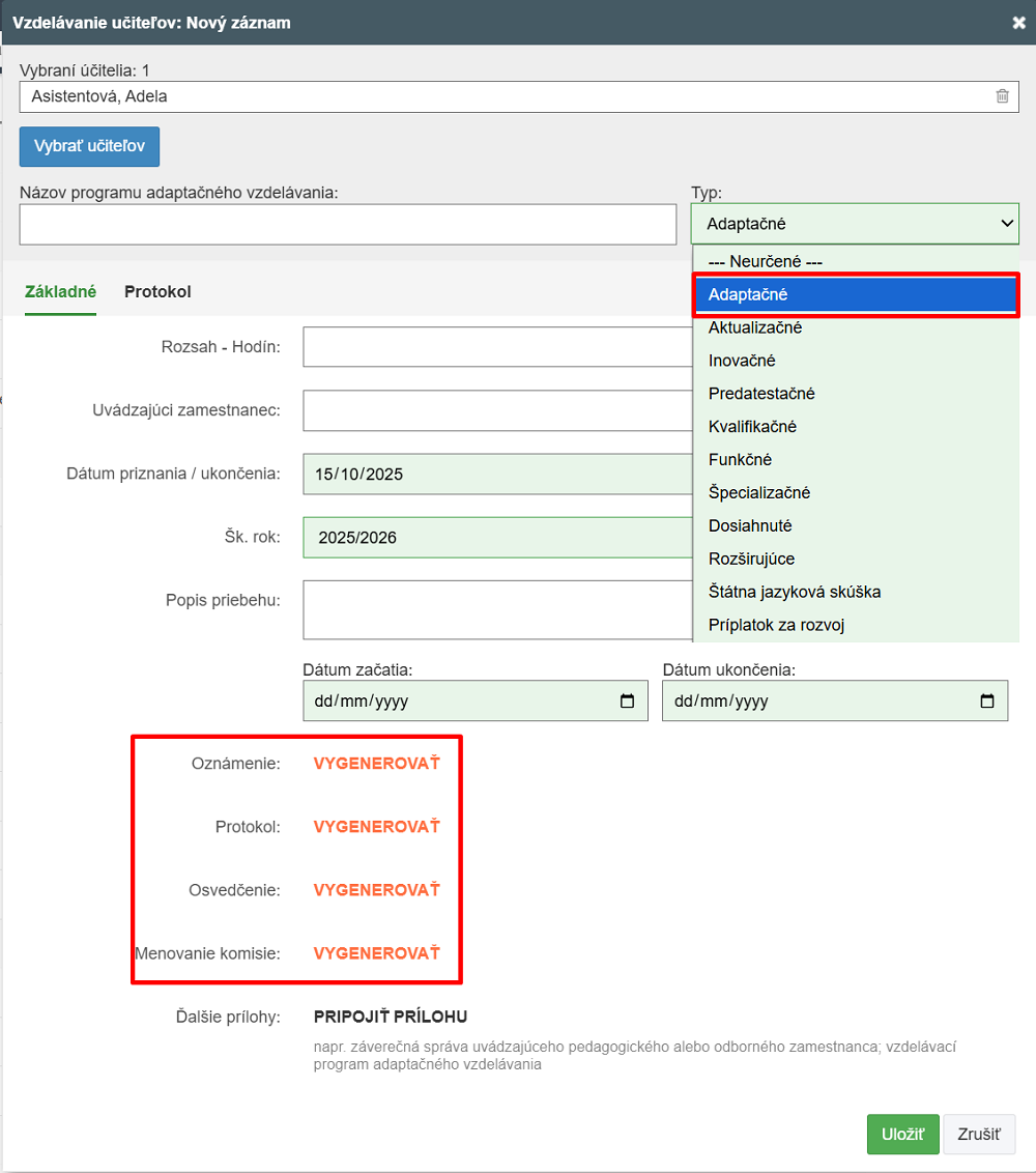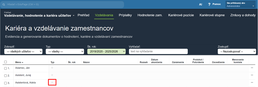 Pri učiteľovi stlačte znamienko plus v tabuľke evidencie vzdelávaní.