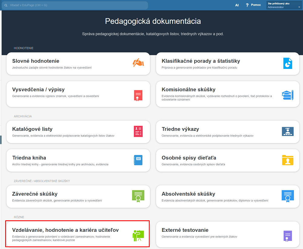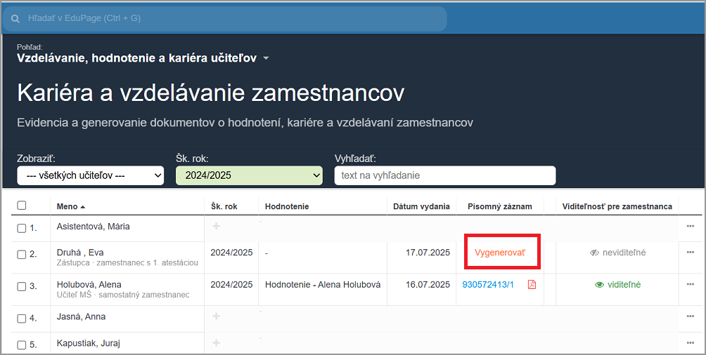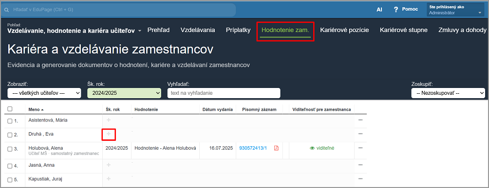 V EduPage môže Hodnotiaci pracovník evidovať a generovať Hodnotenie zamestnancov.