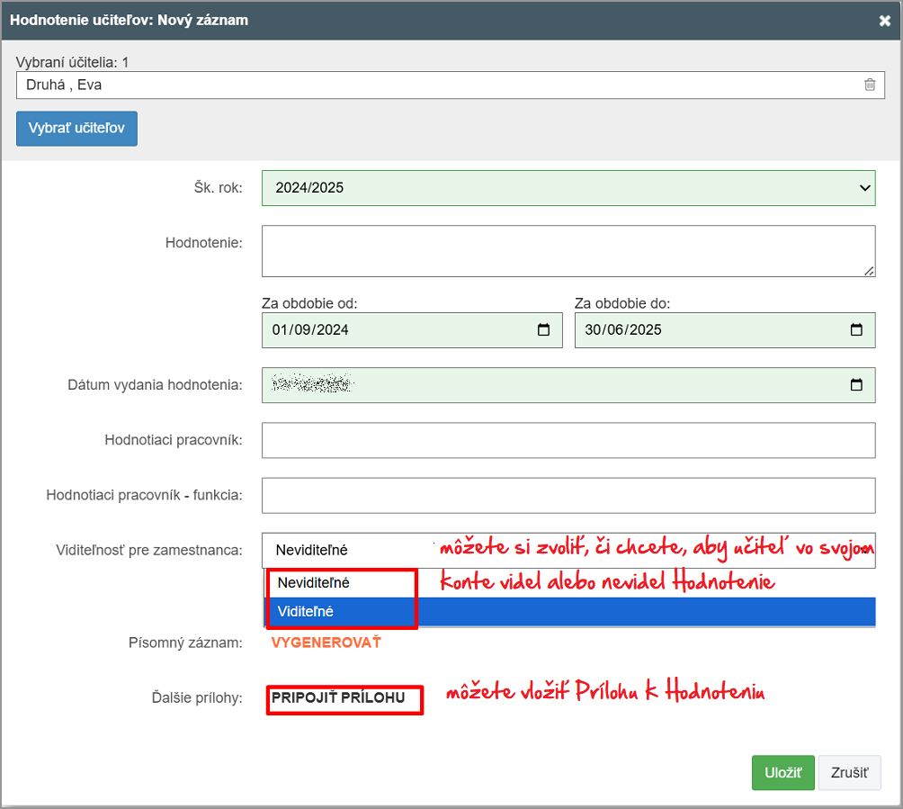 Vyplňte tabuľku s uvedenými údajmi. Hodnotiaci zamestnanec väčšinou odovzdá zamestnancovi Hodnotenie osobne, preto ho môže zviditeľniť až neskôr alebo vôbec. Záznam uložte.