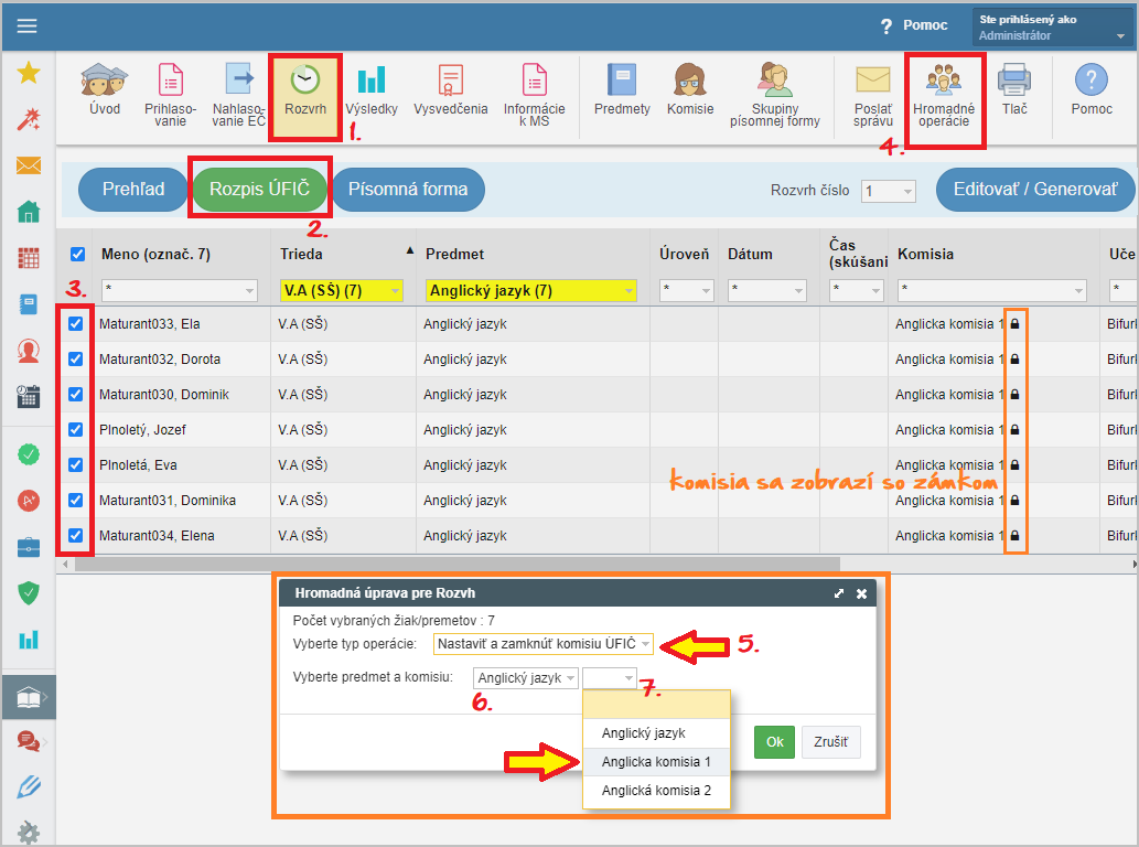 V časti Rozvrh / Rozpis ÚFIČ vyfiltrujte študentov a predmet. Cez hromadné operácie týmto žiakom nastavte konkrétnu komisiu pre vybratý predmet.