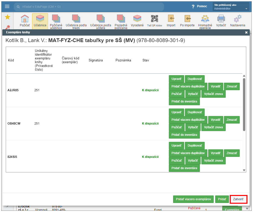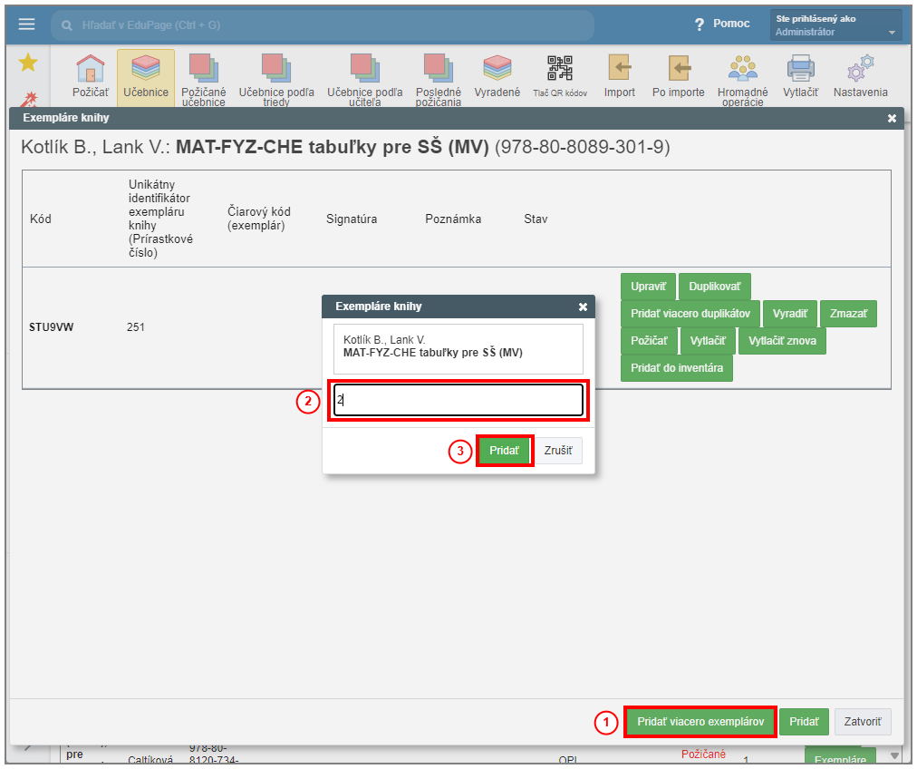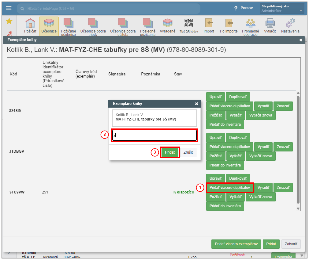 V Sklade učebníc môžete vytvoriť viac duplikátov s vyplnenými údajmi naraz. Vyberte "Pridať viacero duplikátov" v riadku požadovaného exempláru. V zobrazenom okne zadajte počet kusov a potvrďte "Pridať".
