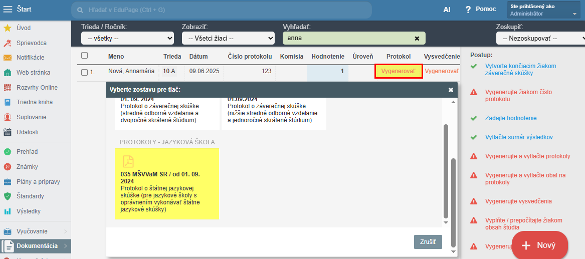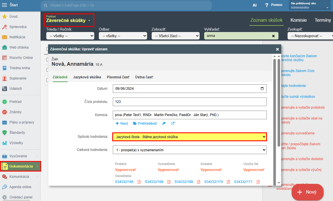 Protokol, ktorého súčasťou je aj odpis vysvedčenia, nájdete v module Záverečná skúška. Nezabudnite určiť spôsob hodnotenia — je dôležitý pre správne zobrazenie všetkých potrebných informácií týkajúcich sa jazykovej školy.