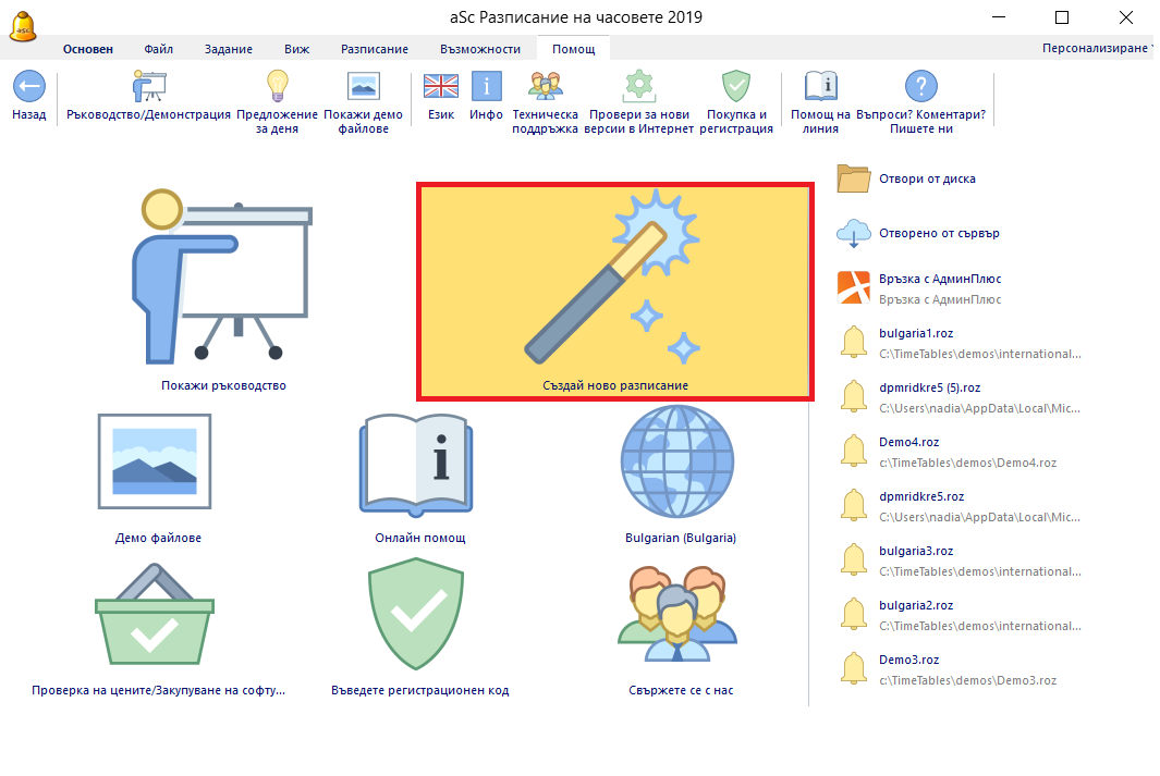 Създаване на ново или отваряне на съществуващо седмично разписание.