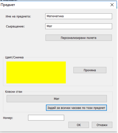 Тук можете да определите класните стаи, в които ще се преподава определен учебен предмет.