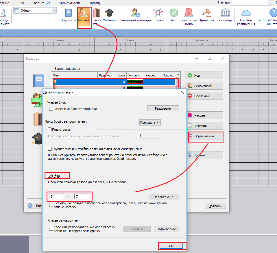 Ако учениците, обаче, трябва да обядват по време на петия или шестия час, и програмата трябва да избере един от тях, трябва да уточните кой, за да може алгоритъмът да остави свободно време за обяд всеки ден. Можете да направите това в Клас/Ограничения.