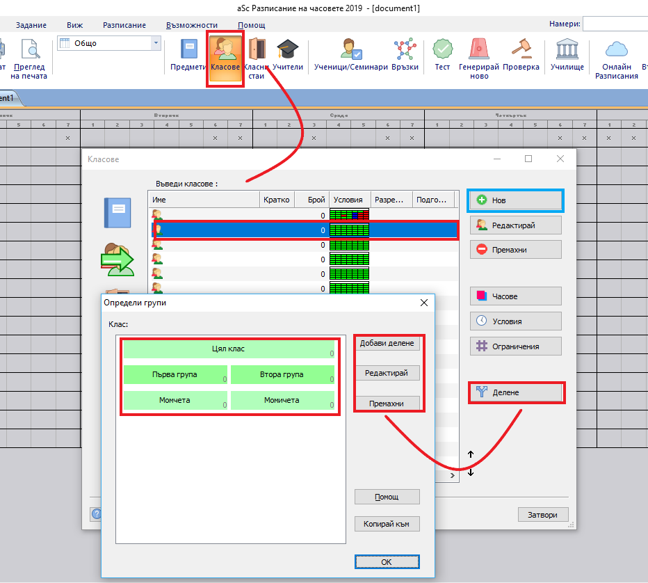 Всяко делене може да бъде изтрито. В този случай всички часове, които са заложени на това делене, също ще бъдат изтрити. Ако редактирате имената на групите, но не промените броя на групите в дадено делене, всичко ще бъде запазено. Така ще може да корегирате правописни грешки или да модифицирате имената на групите в дадено делене.