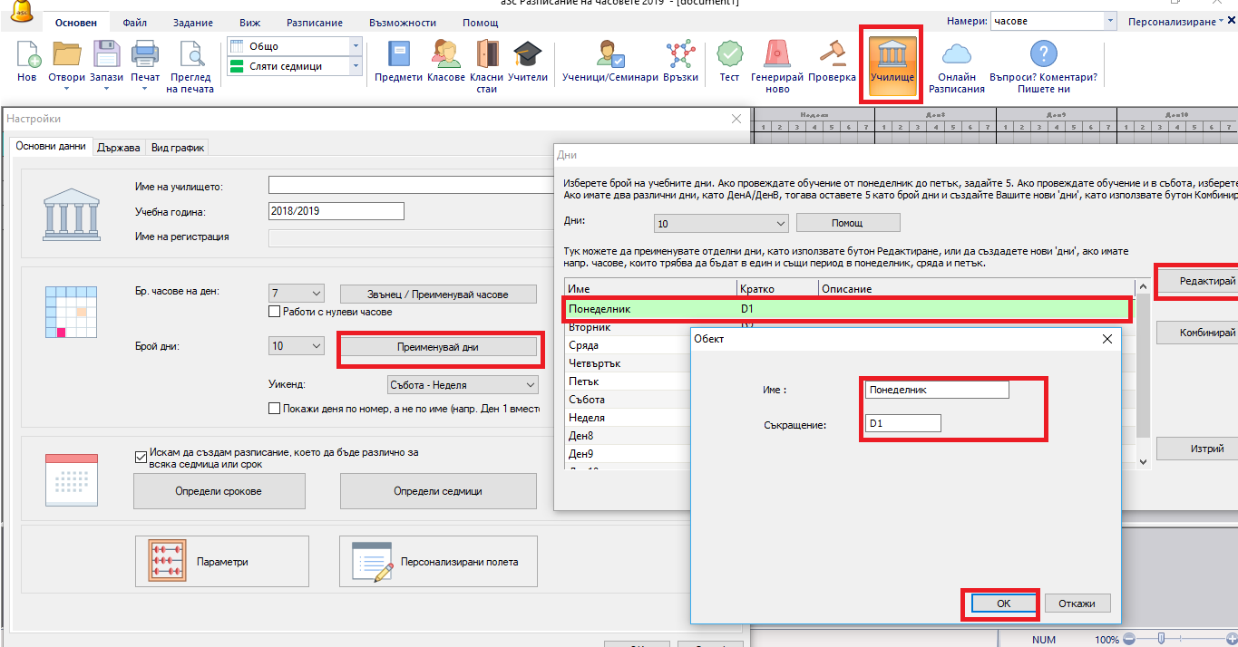 Ако оставите полето празно, тогава програма ще използва имена по подразбиране. Имената по подразбиране на понеделник, вторник... (при разписание за повече от 7 дни имената по подразбиране са Ден 1, Ден 2...).