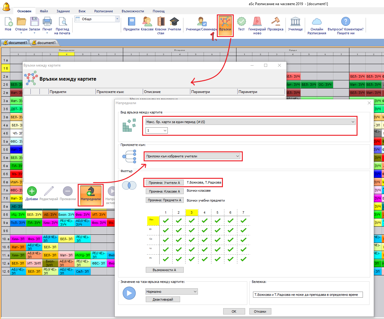 Обикновено не е нужно да обозначите този вид ограничение, тъй като повечето случаи са решени от факта, че учителите трябва да използват същата класна стая или че те преподават на същата група ученици. При положение, че имате двама отделни учители, и не желаете те да преподават по едно и също време, можете да определите разширена връзка с картата, която казва – максимум 1 карта на всяка позиция: