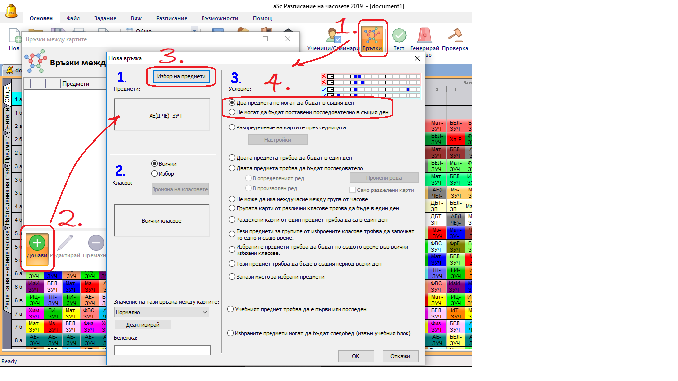 Можете да създадете връзка в картата, която определя, че два учебни предмета не могат да са един след друг или да са в същия ден: