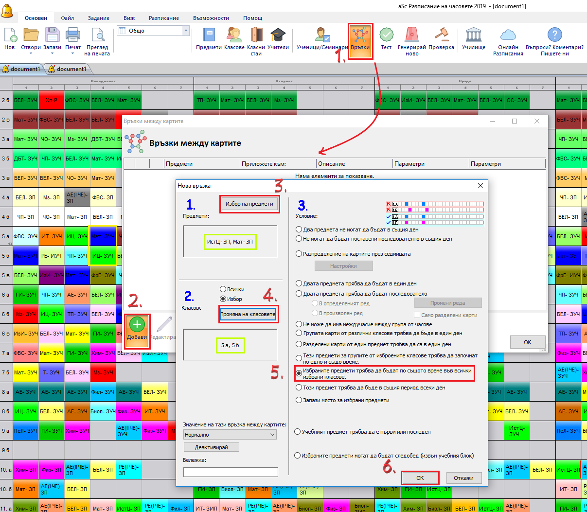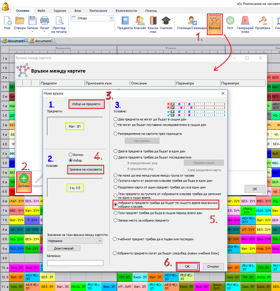 3) Освен това е възможно да кажете, че два (или повече) учебни предмета трябва да бъдат на същите позиции в 5.A клас и в 5.Б клас.
