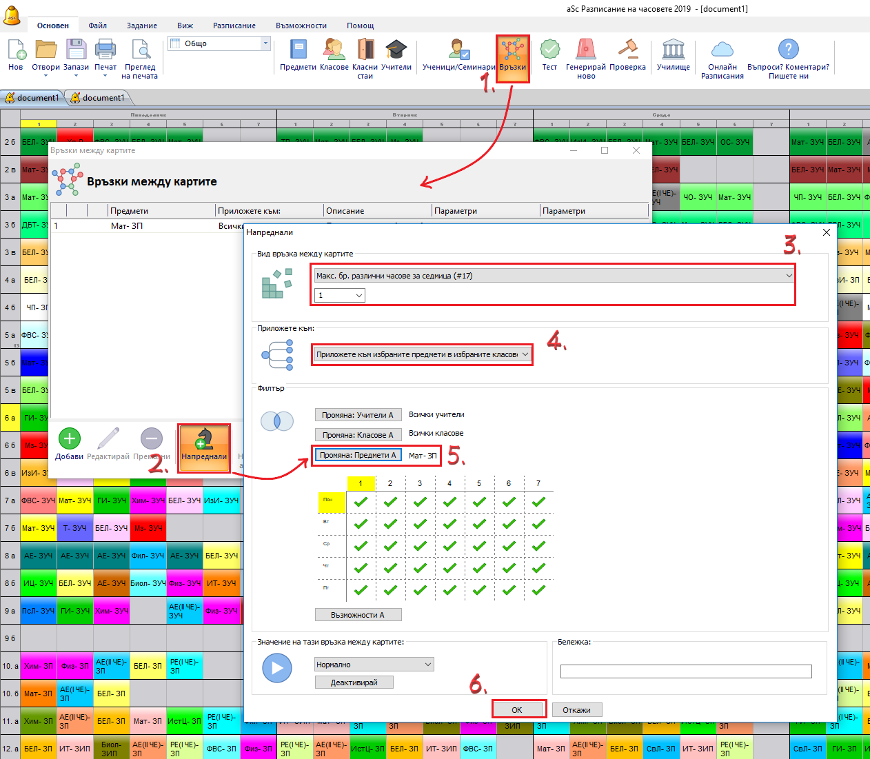 Разширено използване: В някои случаи може да се наложи да използвате разширена връзка в картата. Например, ако един клас има 2 часа Английски език с учител А и 3 часа разговорен Английски език с учител Б и желаете и двата учебни предмета да са по едно и също време всеки ден - Използването на разширените връзки в картата е както следва: