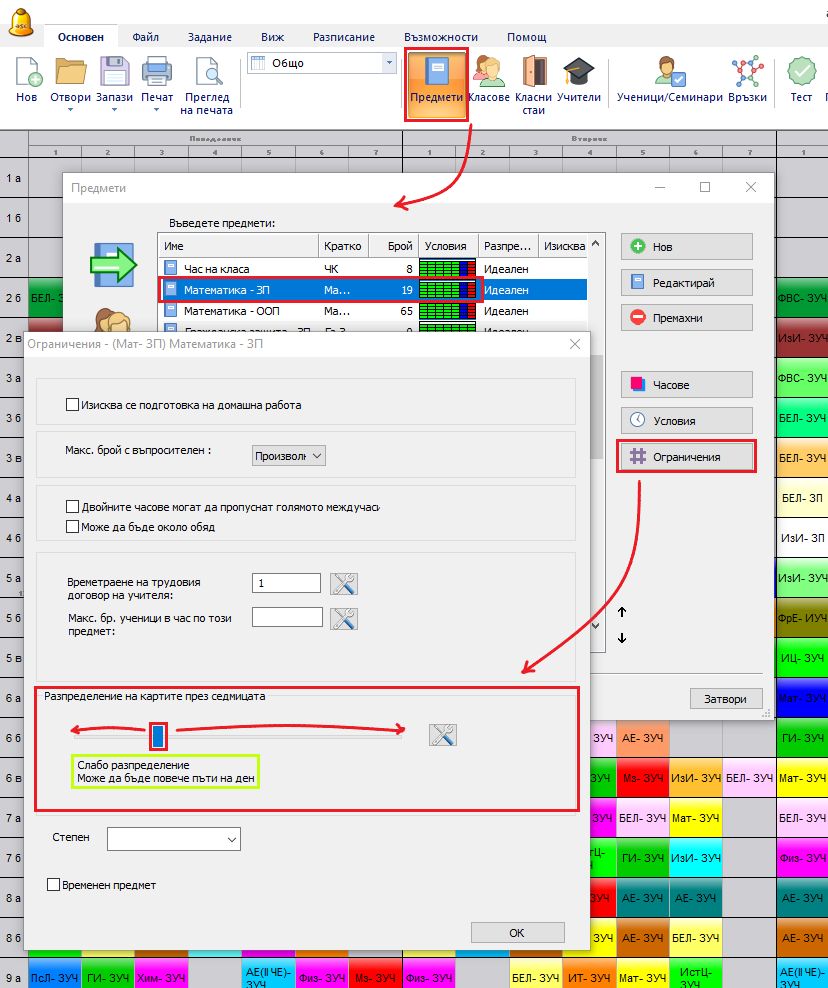 В ограничениято по предмети можете да намерите плъзгача. Колкото по-надясно е плъзгача, толкова по-равномерно предметът е разпределен през седмицата.