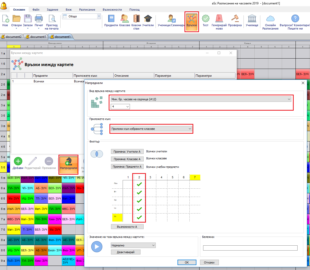 2. След това можете да ограничите колко пъти това ще се случва чрез връзки в картата; ще се каже, че клас трябва да има поне 4 часа, които да започват първия учебен час: