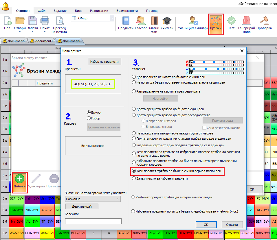 Bнимавайте: в повечето ситуации не ви трябва да конфигурирате/настройвате тази връзка в картата, защото задавате часовете на групите и само групите от същия поток могат да бъдат по едно и също време. Така софтуерът няма да поставя Испански език за Група1 заедно с Физическо възпитание за Момчета. Вижте: Делене на групи