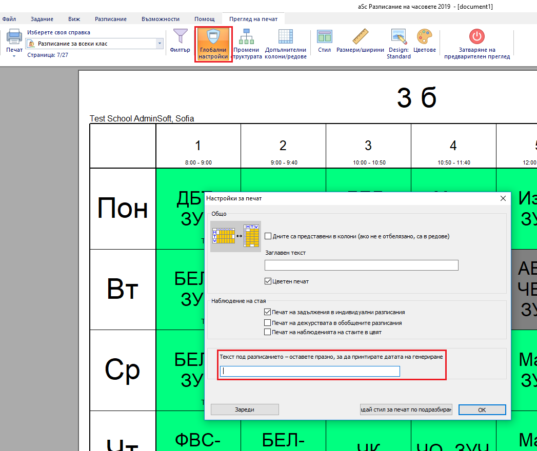 По подразбиране софтуерът принтира датата от последната промяна в долния ляв ъгъл на разписанието.Можете да промените това в Глобални настройки.