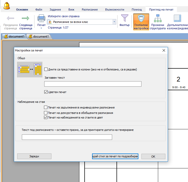 Обърнете внимание, че това се отнася само до настройки на разпечатки на разписанието, не за дизайн на разпечатки.