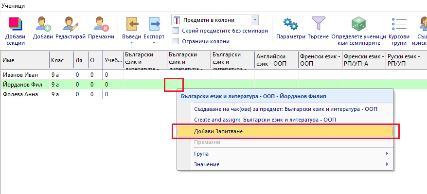 Можете да използвате CTRL и изберете повече редове (ученици) и след това като кликнете с с десен бутон на мишката, ще се добавят предметите към повече ученици.
