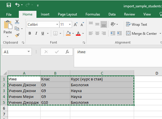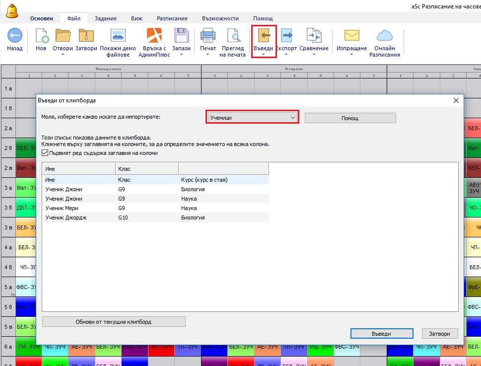 - ако вашето разписание вече съдържа учиници, курсове, класов , въведените данни ще се опитат да намерят сходни с тях. Ако съответният обект не е намерен, ще бъде създаден чрез въвеждане.