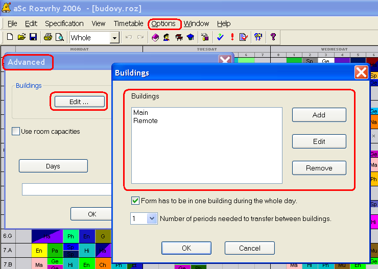 Nota: No necesita introducir edificios si las lecciones se imparten sólo en un edificio o no le preocupan los tránsitos entre lugares durante la creación del horario.