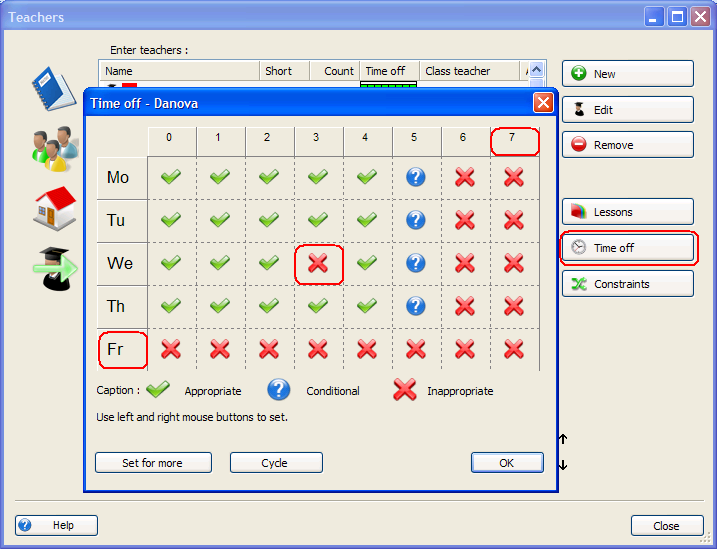 Para clases, profesores, aulas y asignaturas puede definir el llamado "Tiempo libre". Esto define cuando la lección puede impartirse (verde) y cuando no (rojo). También puede definir las llamadas "posiciones interrogativas", donde las leciones pueden impartirse pero desearía evitar tenerlas aquí: