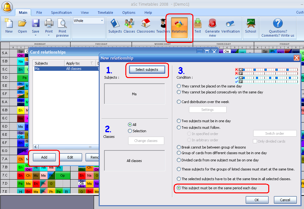 Solamente agregue la relación entre fichas indicando "La asignatura debe ser en el mismo horario en cada dia:"