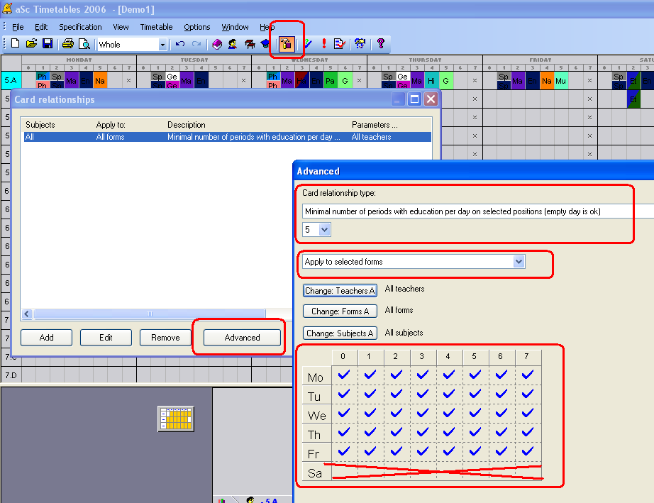 En este caso debe definir relación avanzada entre fichas que definirá el número mínimo de lecciones en un día y especificar algunos días. Definirá que quiere el mínimo de 5 lecciones en lunes – viernes: