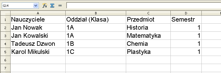 Jeśli nad określoną kolumna widnieje puste pole, należy kliknąć na nie lewym przyciskiem myszki i z listy rozwijanej wybrać rodzaj danych w kolumnie (np. Semestr czy Przedmiot).