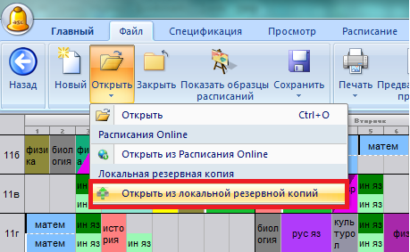 В случае если Вы утратите файл расписания, случайно сохраните неверные данные или он будет поврежден, Вы можете просто выбрать "Файл / Открыть из локальной резервной копии":