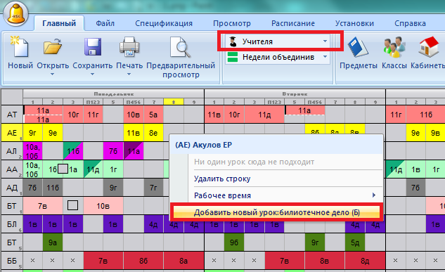 Потом переключитесь в режим просмотра расписания учителей и щелкните правой кнопкой мыши на позицию, чтобы добавить предварительный урок в расписание учителя.